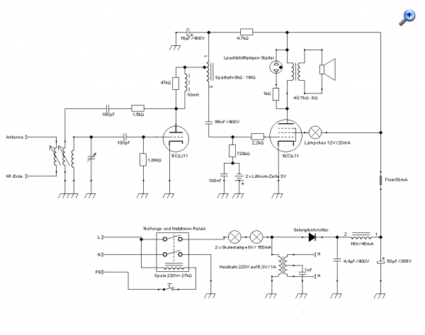 - Das komplette Radio soll mit Bauelementen auskommen, die es nach diesem Funktionsprinzip und aus diesen Materialien schon 1935 gab. Das heißt also bis auf Selen Halbleiterverbot - Es soll ein Einröhrenempfänger sein, um den Geist dieser Ära, als eine Röhre noch recht teuer war und möglicht viel aus ihr herausgeholt werden mußte, etwas nachzuempfinden - Kein technischer und ästhetischer* Stilbruch, das heißt ein klassischer Audionempfänger mit der ECL11 und Trafos / Induktivitäten in offener Bauform *(für Teile oben auf dem Chassis) - Sparsamkeit im Stromverbrauch: Das heißt Selengleichrichter und Verzicht auf den Anodenspannungs-Netztrafo. ("Allstromgerät") Meine Prognose liegt bei 20W - höchstmögliche Empfangsleistung aus der ECL11 herausholen: Das bedeutet die Verwendung eines Zwischenübertragers, der rechnerisch sogar 1:11 herauftransformiert (VE301W: 1:4)