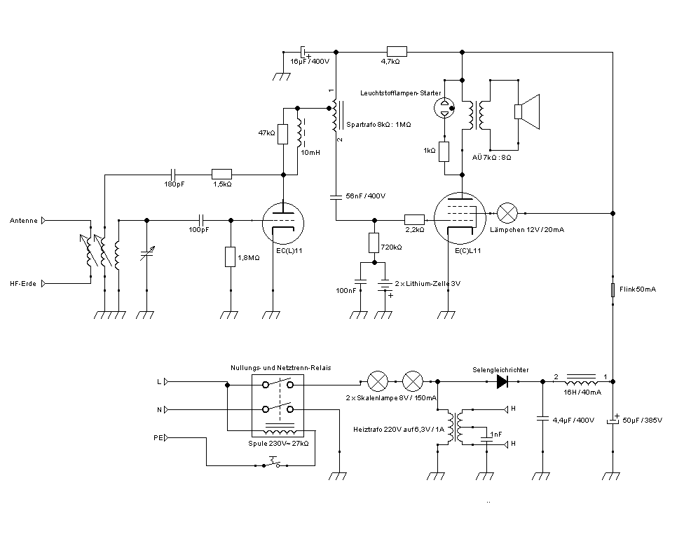 Besonderheiten der Schaltung: - Spartrafo als Zwischenübertrager. Die Kopplungsweise gleicht der Drosselkopplung. - Skalenlämpchen reduzieren die lokalen 230V auf 220V. Dadurch liefert der alte Heiztrafo, den ich zum Glück noch gefunden habe, exakt 6,3V - besonders kleiner Ladekondensator, Holchleistungs-MKT-Typ. Zusammen mit der Drossel bewirkt er in den Halbwellen-Pausen eine zügige Entladung (Brummspannung an der Stelle >100V) und damit eine geringere Spannungs-Belastung des Selengleichrichters in der Sperrphase (U sperr = U Netz neg Spitze + U Ladekondensator). Weiterhin bewirkt diese Maßnahme eine starke Verringerung des Ripplestroms. - Schirmgitter-Sicherung, visuelle Schirmgitterstrom-Anzeige und UKW-Schutzwiderstand durch Lämpchen 12V / 20mA - Überspannungsschutz bei offenem AÜ-Ausgang durch Glimmlampe - Gitterbatterie, dadurch Fortfall des Widertsandes in der Minusleitung, Chassis bekommt exakt N-Potential des Netzes - Nullungs-und Netztrenn-Relais, verhindert Einschalten wenn die Netzphase auf dem Chassis zu liegen käme. Achtung, ersetzt keine galvanische Netztrennung! Gerät ist bzgl. Berührungsschutz wie Allstromgerät zu behandeln!