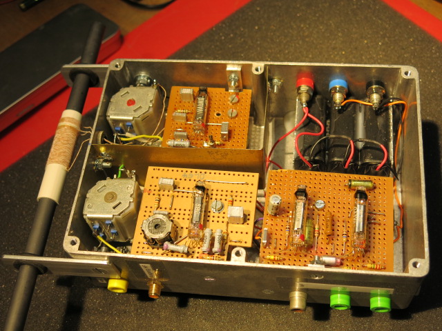 hier kommt ein weiteres Bastelprojekt mit Subminiaturröhren, wiederum ein Batterie-Zweikreiser mit Entdämpfung auch in der Vorstufe. Audion und Vorstufe müssen getrennt abgestimmt werden. Durch wegschalten der Vorstufe kann er auch als Einkreiser betrieben werden, dann allerdings mit Drahtantenne. Zur Ferritantenne der Vorstufe kann zusätzlich ein 50cm Draht gesteckt werden. Der Signalpegel steigt dadurch deutlich, der Störpegel allerdings auch. Empfang zwischen 400 und 2000 kHz. Der gesamte Empfänger ist mit 4x DL64 bestückt. Ursprünglich waren für den NF-Teil 2x DF651 vorgesehen, die erzielbare Lautstärke hat aber nicht befriedigt. Die Rückkopplungsspule ist in beiden Stufen an das Schirmgitter gelegt. Anodenspannungsversorgung 27Volt, Heizung 1,25Volt, alles über Akkus. Der Empfänger ist mit Buchsen für Antenne, Kopfhörer, NF-Ausgang, HF-Ausgang und Ladebuchsen ausgestattet.