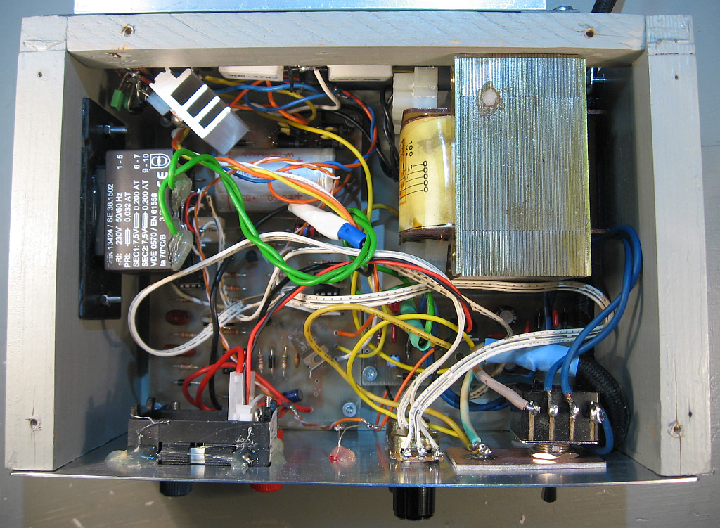 Der Kabelsalat ließ sich leider nicht vermeiden. Das Gerät hat einen Schutzleiter und hat den Dauertest bei 9 Volt und 3 Ampere überstanden. Das Netzteil steht in einem Regal, so dass sich niemand am drehenden Lüfter oder an dem heißen Kühlkörper verletzen kann. Es ist also ein Labormuster für den eigenen Gebrauch unter Aufsicht. So baut die Industrie natürlich nicht. Ich mache das für mein eigenes Vergnügen. Die Arbeitsstunden habe ich nicht gezählt.