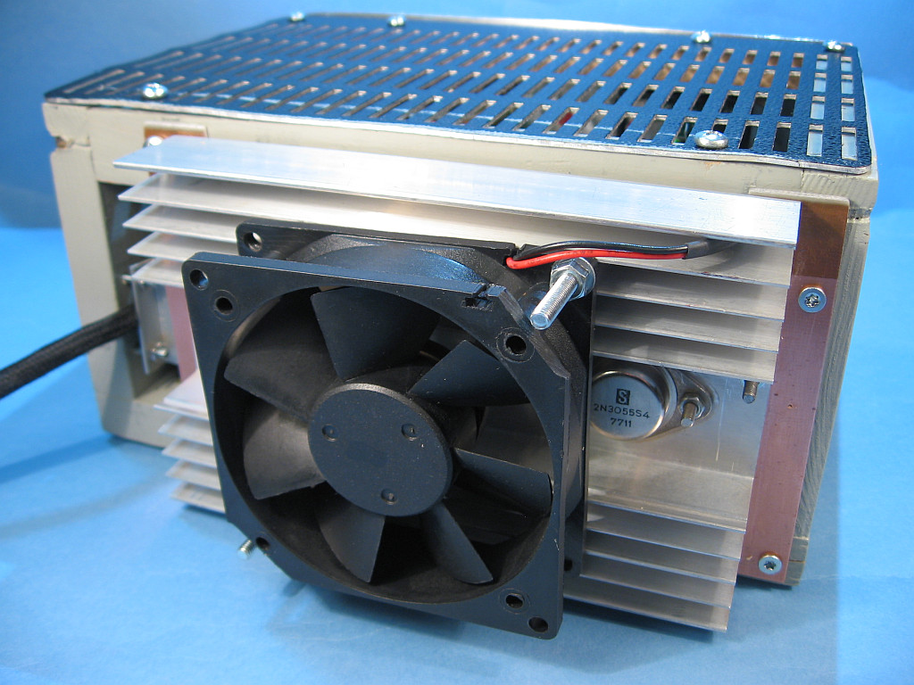 Meinen Aufbau habe ich bei 9 Volt / 3 A (das sind etwa 45 Watt Verlustleistung) ohne Lüfter mit 60 °C im Gehäuse und 50 °C des Kühlkörpers betrieben. Mit Lüftern müssten nach überschlägiger Berechnung genügend Reserven für einen Dauerkurzschluss bei 3 Ampere existieren. Das wären dann fast 75 Watt, die an den beiden 2N3055 vernichtet werden. Ich will mein Netzteil aber nicht zu Tode testen. Bei voller Drehzahl und 45 Watt Verlustleistung kühlt der Lüfter den Kühlkörper in zwei Minuten von 50 °C auf 40 °C herunter. Da sind also einiges an Reserven vorhanden. Problematisch ist der Trafo bei 3 Ampere, der dann ohne Gehäuse-Lüfter 50 °C heiß wird. Den Hilfstrafo hatte ich mit Heißkleber befestigt, der weich wurde und der Trafo löste sich von der Verklebung.