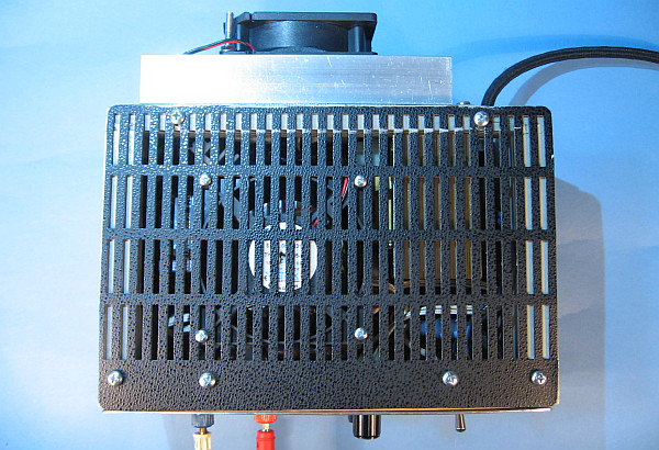 2. Die gedrängte Bauweise führt bei hoher Dauerbelastung mit 9 Volt und 3 Amp zu einer Temperatur von über 50 °C im Gehäuse. Schuld daran ist der Netztrafo, der bei Belastung 40 bis 50 °C heiß wird und der Kühlkörper selbst. Deshalb wurde ein zusätzlicher Lüfter auf den Deckel montiert, der nach oben rausbläst. Durch den zusätzlichen Lüfter wird es jetzt sehr eng im Gehäuse.