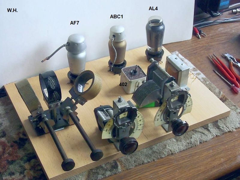 Mein Konzept ist wie folgt: Von der Antenne über den Spulenschwenker zur HF-Vorstufe mit der AF7. Eine Rückkopplung (Entdämpfung) geschieht über die rechte schwenkbare Spule. Der zweite abgestimmte Kreis ist mit der gekapselten (um ungewollte Schwingungen zu unterbinden) Mu-CORE Type 402 Spule/Transformator aufgebaut und leitet zur Diode der ABC1, wo die Gleichrichtung (Demodulation) stattfindet. Die so gewonnene NF steuert die Triode der ABC1 und nach Verstärkung geht's über ein Lautstärkepoti zur Endstufe mit der AL4.