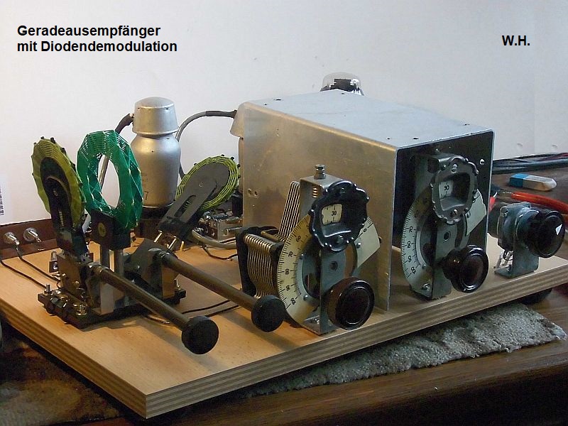 Dein Radio, ein Zweikreiser mit Diodendemodulation war ein Gerätetyp der so zwischen 1932 und 1940 bei vielen Hersteller im Programm war. Ab ca. 1936 mit der Entwicklung der "harmonischen" Röhrenserie wurde dieser Empfängertyp vom Super endgültig verdrängt. Man konnte mit 3 Röhren einen vollwertigen 6 Kreis Super bauen, die Röhre für das Netzteil ausgenommen denn diese brauchte man ja auch beim Geradeausempfänger. Diese 3 Röhren waren die Verbundröhren ECH, EBF, ECL der sog. Stahlsockel Röhren. Der Vorteil der Ersparnis war damit fast nicht mehr gegeben, wohl aber die Vorteile des Supers. Auch andere Hersteller wie Philips mit den "Miniwatt" Röhren sind hier zu nennen. Zum Schluss, wie könnte es auch anders sein, einen Buchtip für den Bau von Radios mit der 30er Jahre Technik: " Schule des Funktechnikers" von Hanns Gunther und Heinz Richter Franck'sche Verlagshandlung, Stuttgart 1939 Band I und vor allem II. Diese Antiquarischen Bücher werden immer wieder bei ebay und Co. angeboten. Im Bd. II wird der mechanische Aufbau eines Zweikreisers, sogar mit Fotos gezeigt. Im Text sind die "Regeln" für den erfolgreichen Bau eines Empfängers enthalten.