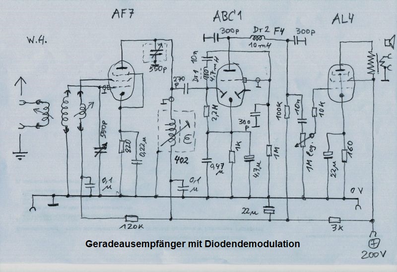 "Ich schrieb schon, mein Interesse gilt herauszukristallisieren (schönes Wort, nicht wahr?), was bringt die Diodendemodulation gegenüber der Gittergleichrichtung (Audion) für Vorteile oder Nachteile? Hierzu wird ein 4-pol. Umschalter eingefügt, der die erforderlichen Schaltungsänderungen -ohne weitere Umstände- macht. Habe vor, an Hand von Oszillogrammen, ein schwaches Antennensignal mal mit 30%iger und 70%iger Modulation NF-mäßig darzustellen. Dann dieselbe Prozedur, jetzt aber mit starkem Antennensignal."