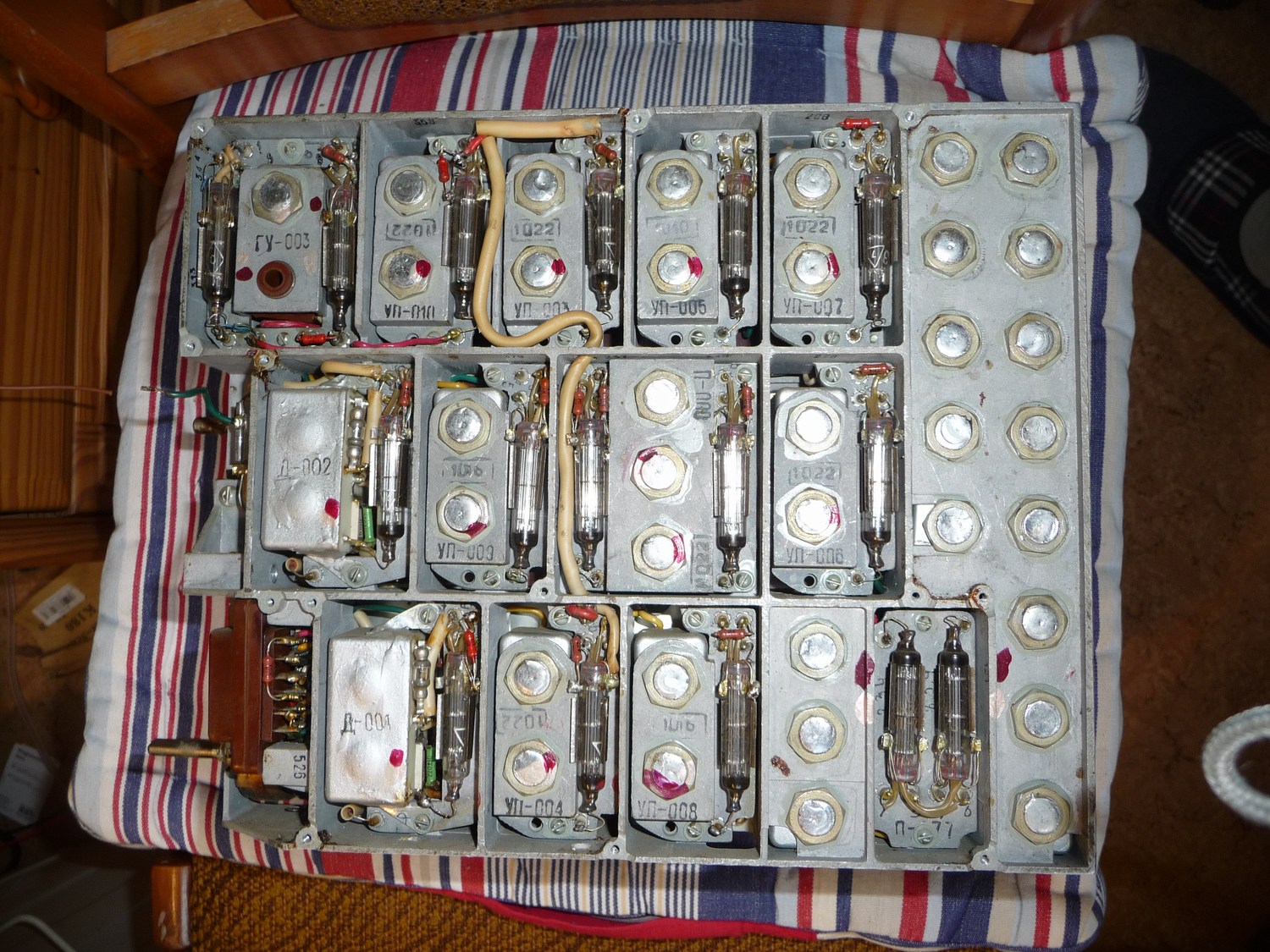Hier mal zwei Bilder aus meinem R-323 "Tsifra" (20 - 100 MHz, 28 Bleistiftröhren) und R-326 "Shoroh" (1 - 20 MHz, 19 Bleistiftröhren).