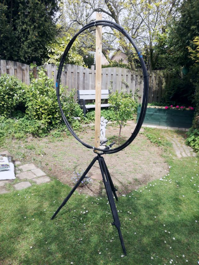 Aus der Zeit, wo ich noch auf 144 MHz aktiv war (PA0FTF, Tropo, Aurora, Es), stammen ein paar Meter Koaxkabel, mit 17mm Außendurchmesser und 3,5mm als Innenleiter. Das habe ich zu einem Ring mit zwei Windungen zurechtgebogen und ergibt einen Durchmesser von 1,20m.