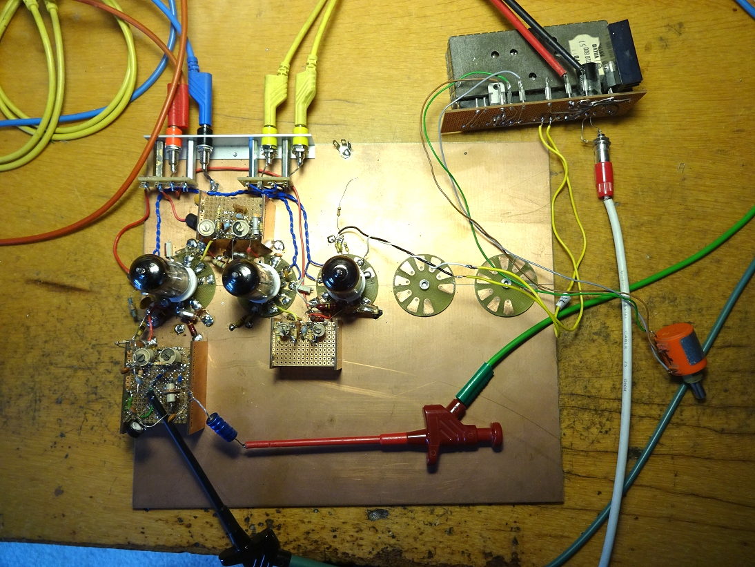 Ich habe ein paar Fotos vom aktuellen Zustand des Projekts gemacht. Gesamtansicht der Experimentierplatte. Der FM-Detektor, am unteren Rand der Platte, ist auf einer Lochrasterplatte aufgebaut, ebenso das Bandfilter links neben/zwischen den beiden Röhren.