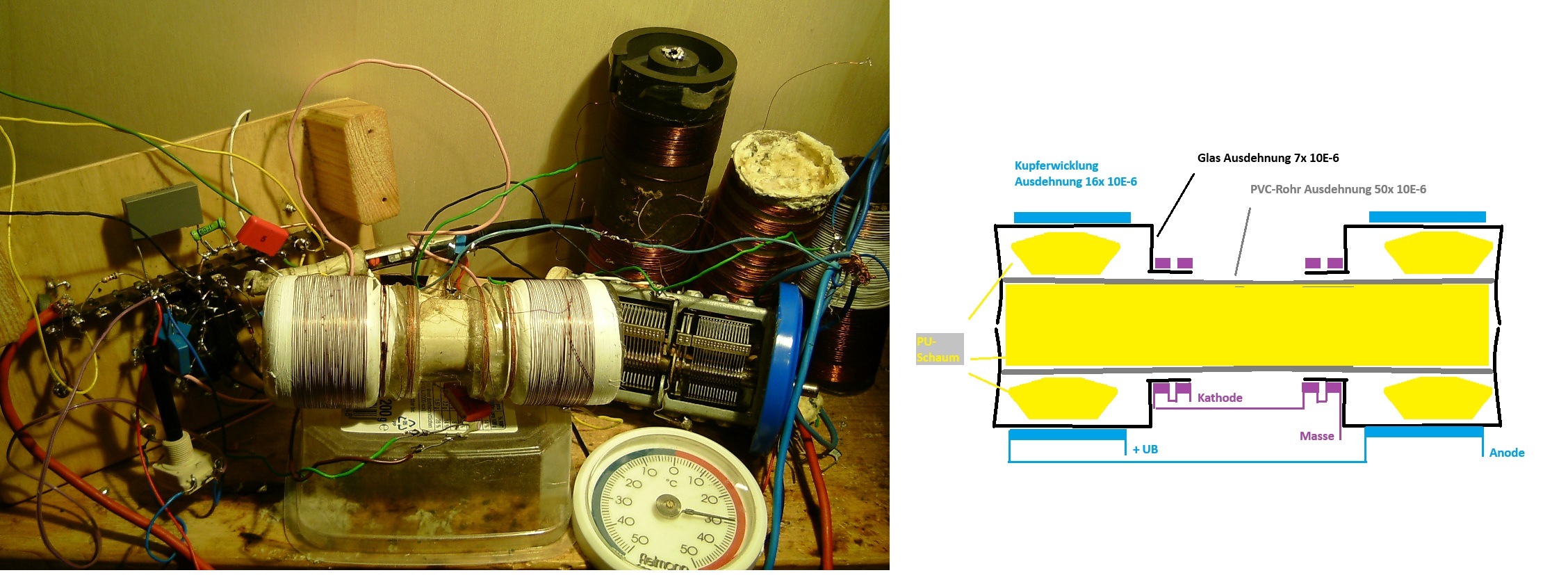 Ergebnis des Versuches: Kreisspule unbedingt vor Erwärmung schützen. Versuche, Erwärmung zu kompensieren unbefriedigend