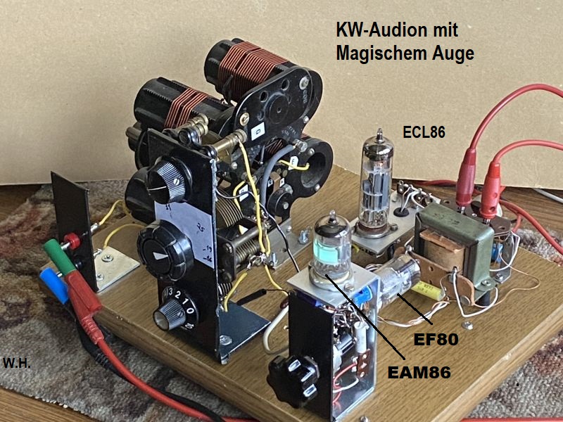 Ein Magisches-Auge EAM86, welches als Audion und gleichzeitig zur Anzeige der Feldstärke des empfangenen Signal dient! Dazu wurde der bereits bestehende Aufbau mit zwei FET umgebaut auf einen Dreiröhrenempfänger für die Lautsprecherwiedergabe.