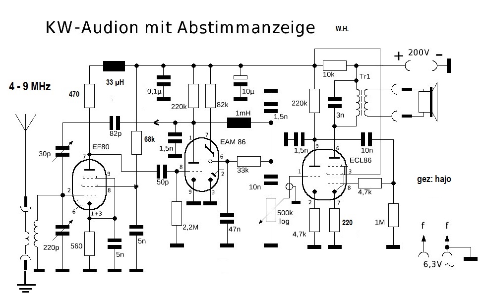 Richtig: Für die HF ist die EF80 das erste Bauelement und das zweite bildet die Triode der EAM86. Von der Anode wird die HF rückgeführt zum g1 der EF80.