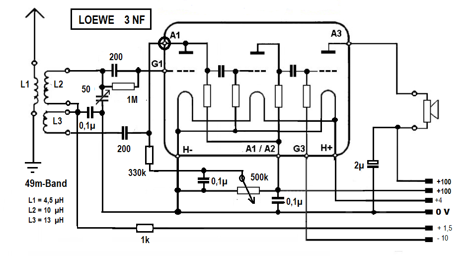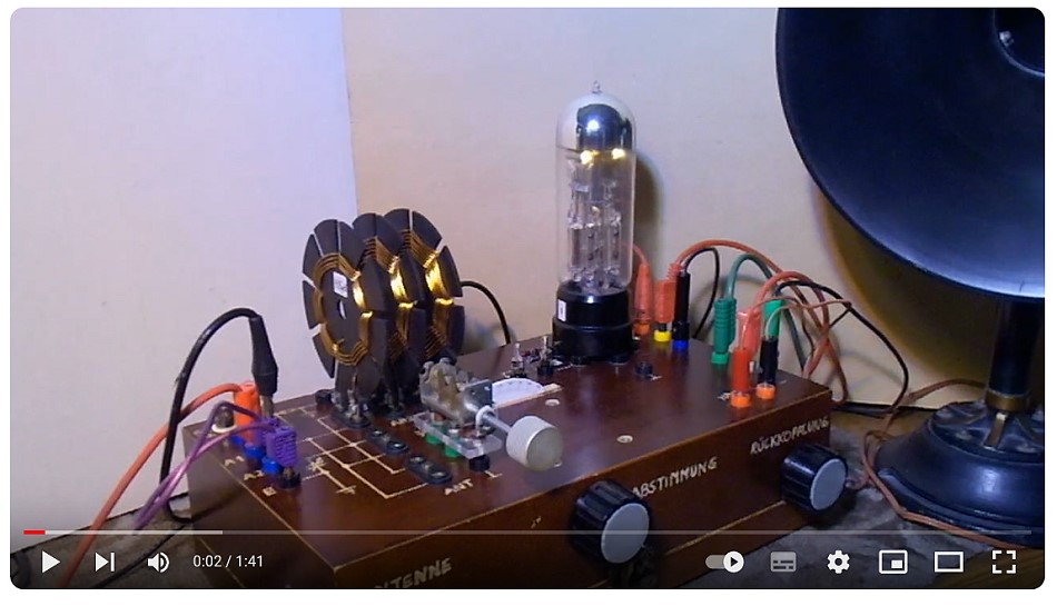 Mit dem neulich von Tom (DK1IS) erworbenen experimentellen Aufbau eines Audions (plus Rückkopplung) mit der Loewe Mehrfachröhre 3NF, habe ich heute Abend KW-Empfang im 49m-Band gehabt.