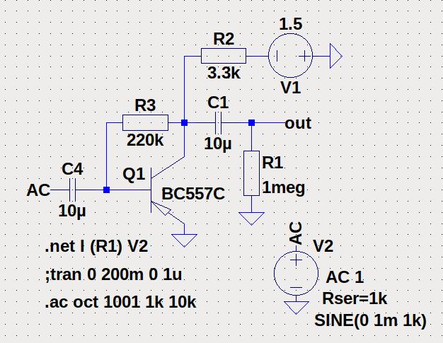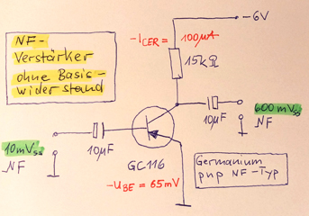 Das konnte ich mir schwer vorstellen, also habe ich versucht, die Schaltung mit verfügbaren alten DDR-Germaniumtransistoren nachzubauen. Offenbar stellt sich ein Arbeitspunkt über den Kollektor-Emitter-Reststrom ein. Doch reicht das für eine Basis-Vorspannung und wie hoch ist diese dann? Hier das Ergebnis mit einem GC116.