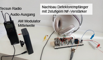 Im Buch heißt es auch: "Die Schaltung sei zu Studienzwecken zum Nachbau empfohlen". Natürlich ist es zwecklos, ohne starken Ortssender hier etwas zu empfangen, was dann NF-seitig zweistufig verstärkt werden kann. Deshalb kam mein kleiner Mittelwellenmodulator zum Einsatz, den ich im Forum schon vorgestellt habe. Anstelle des Kopfhörers mit 300 Ohm Impedanz habe ich einen Ausgangsübertrager zu einem niederohmigen Kopfhörer genutzt. Ein kleines Video zu den Ergebnissen ist in Vorbereitung. Es gibt dann noch eine Überraschung: Anschluss eines Lautsprechers.