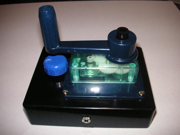 Es handelt sich bei dem Gerät um ein Selbstbau- Kurbelradio, dass statt eines Akkus, einen Goldcap von 1F als Energiespeicher hat. Das hat den Vorteil, dass der 1F Kondensator in nur dreißig Sekunden geladen ist und das Radio für eine Spieldauer von ca. 1h, genug Energie hat. Kurbel, Getriebe und Generator sind aus einem alten Bastelkasten für Kinder.