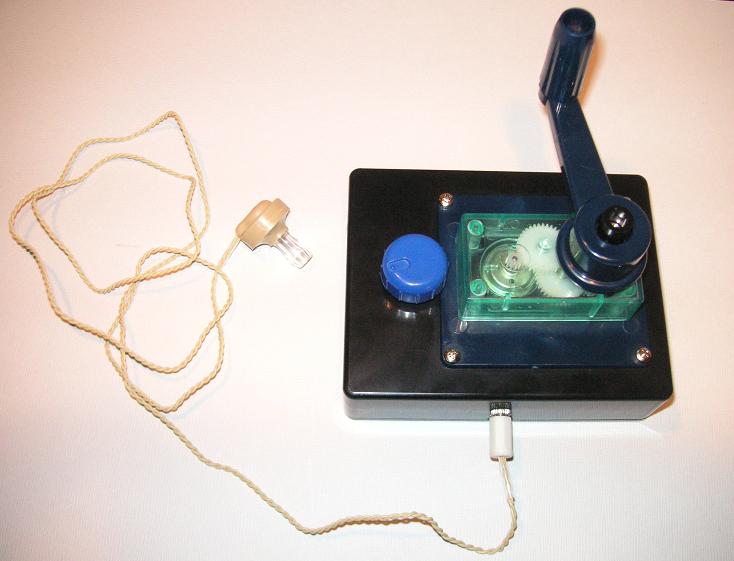 Pluspol: Was mir an Deinem Kurbelgenerator fehlt, ist eine wirksame Spannungsbegrenzung. Oder ist sie bereits innerer Bestandteil der Apparatur? Trotzdem eine gute Idee, die sich schon in früheren Zeiten ähnlich bewährt hat.