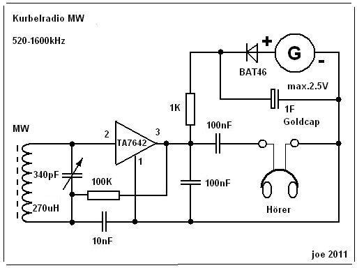 Der Detektorapparat hat mich jahrelang beschäftigt und fasziniert mich, in seiner ausgereiften Form, immer noch. Der DX- Wettbewerbsbeitrag von B. Bosch (RM oder Gollum) ist für mich ein echtes Highlight. Die Schaltungen, die sich nur aus der reinen HF- Energie versorgen, faszinieren bis heute. Auf die Goldcaps bin ich aufgrund meiner Fahrradstandlichtbeleuchtung gestoßen. Diese Bauform ist etwas größer, und beim Suchen kam ich dann auf die 2,5V Kleinvariante. Die sind nicht teuer und kaum größer als ein 100uF Elko für 100V. Im Internet findet man mittlerweile ..zig Kurbelradios. Alle brauchen aber einen Akku und haben im Beipack ein ekliges Schaltnetzteil, damit man von Zeit zu Zeit den Akku voll aufladen kann. Diese sind aber auch vollausgestatte Super u.a. mit Digitalanzeige und Lautsprecher. Sich auf das Wesentliche zu konzentrieren finde ich spannender. Die Energie aus der Umgebung.... ja , Sonne, Wärme, Wind....ein Radio mit Propeller am Fahrrad oder zwei Elektroden im feuchten Waldboden, das macht schon Spaß. Der Goldcap wäre immer als Speicher mit dabei.