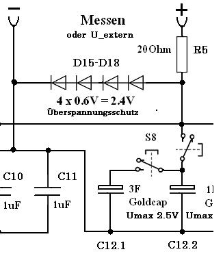die Spannungsbegrenzung wollte ich mit einer 2,5V Z-Diode realisieren. War aber nicht nötig, da ich wirklich nicht mehr als 2,2V, bei voller Anstrengung, herausholen konnte. Da ich keine externen Anschlüsse zu Ladungszwecken eingebaut habe, konnte ich darauf verzichten. Es treten auch keine hohen Spannungsspitzen auf. Das habe ich mit dem Oszilloskop kontrolliert. Die Z- Dioden haben auch häufig einen relativ hohen Sperrstrom und zapfen so unnötig Energie aus dem Goldcap. Bei meinem Experimentierdetektor mit HF- Energieversorgung habe ich zur Spannungsbegrenzung, vier Siliziumdioden (0,6V selektiert) und einen 20Ohm Widerstand in Reihe geschaltet. Das bringt bessere Ergebnisse.