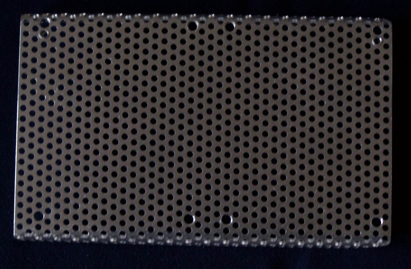 "Als Chassis habe ich Aluminium-Lochblech genommen, es läßt sich im Hobbykeller sehr leicht bearbeiten! Löcher für M3-Schrauben sind zu Hauf vorhanden und passen in der Regel ohne Nacharbeitung, M4-Schrauben prägen ihr Gewinde in die 3mm-Löcher fast von alleine und dienen z.B. für die Befestigung der Transformatoren. Sämtliche Bohrungen und Durchbrüche lassen sich nach dem Aufzeichnen der Aussparungen durch das Durchtrennen der Zwischenstege mit einer Laubsäge und Metallsägeblatt einfach herstellen, Stanzen oder ähnliche Werkzeuge sind nicht erforderlich, eine halbrunde Schlüsselfeile reicht! Ebenso läßt sich das Alu, zwischen zwei Holzleisten gespannt, problemlos biegen."