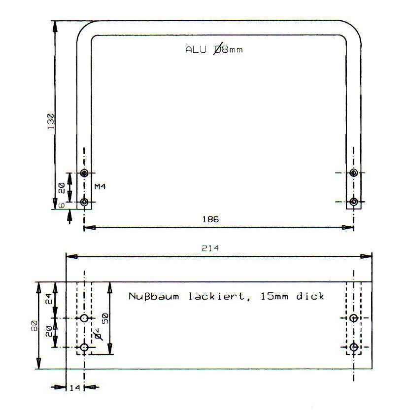 Die gebogenen und gebohrten Alugriffe habe ich in das Holz geschoben und durch das Aluchassis verschraubt.