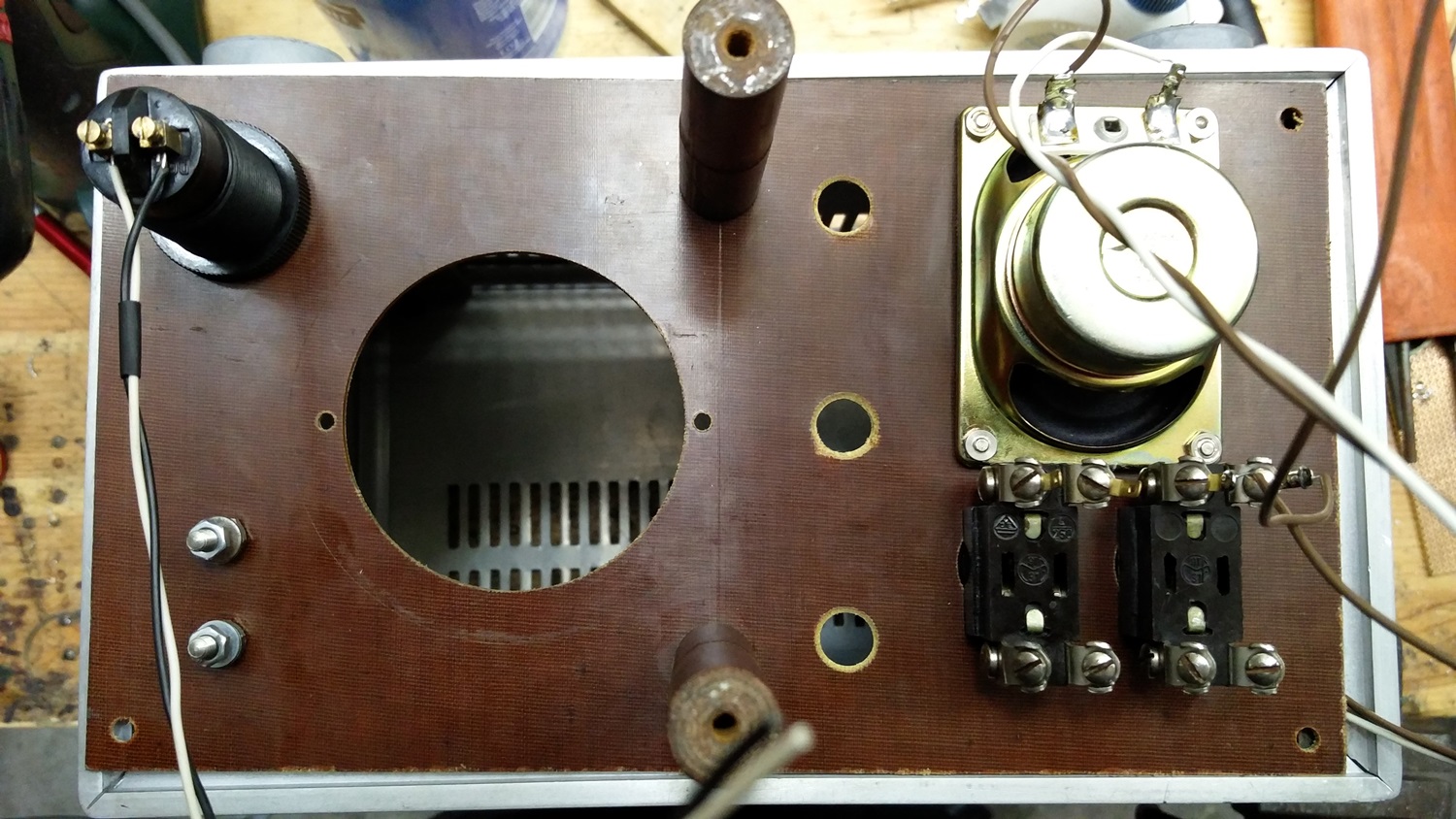 beim Betrieb an der Langdrahtantenne traten immer wieder, vor allem abends Störungen aus dem Kurzwellenbereich auf. Ich vermute, dass es da auch bei starken kurzwellensignalen 455kHz Mischprodukte gibt, welche dann stören. Die Lösung ist simpel. Bei einem Kumpel lag noch eine Pertinaxplatte mit Antennenbuchsen aus einem alten Röhrenradio. die habe ich einfach halbiert und die rückwärtige Spule (wofür ist die eigentlich?!) mit einem 30 pF C zum Schwingkreis umfunktioniert. Abgestimmt auf 500kHz funktioniert das ganze sehr schön, ohne asiatische Rundfunksender... Auf dem oben gezeigten Schaltplan ist diese Einheit schon eingezeichnet.