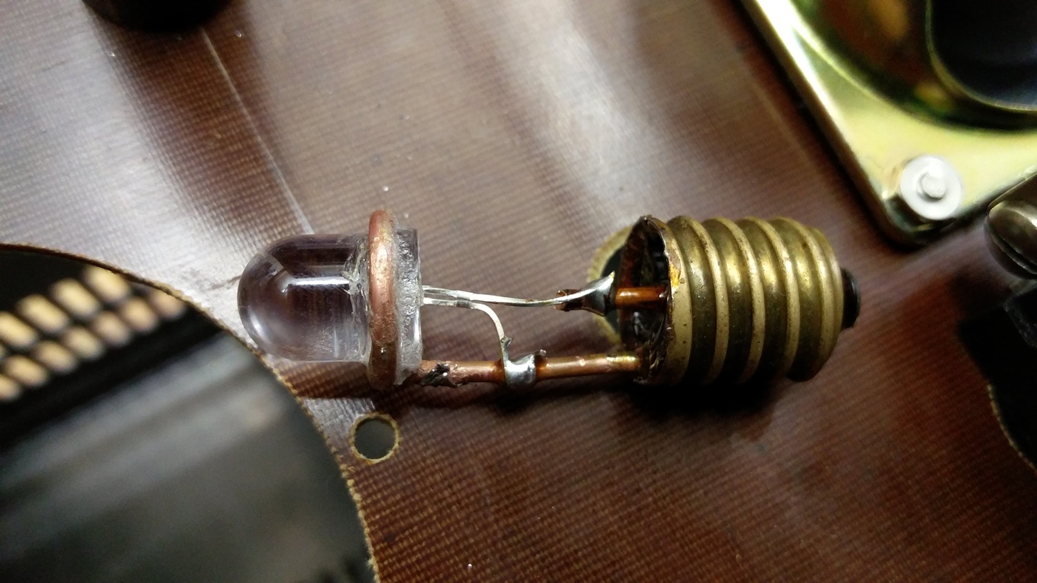Auf dem letzten Bild ist das Leuchtmittel für die dicke Signallampe zu sehen. 10mm bernstein LED in einen E14 Sockel geschnitzt. Patent angemeldet.