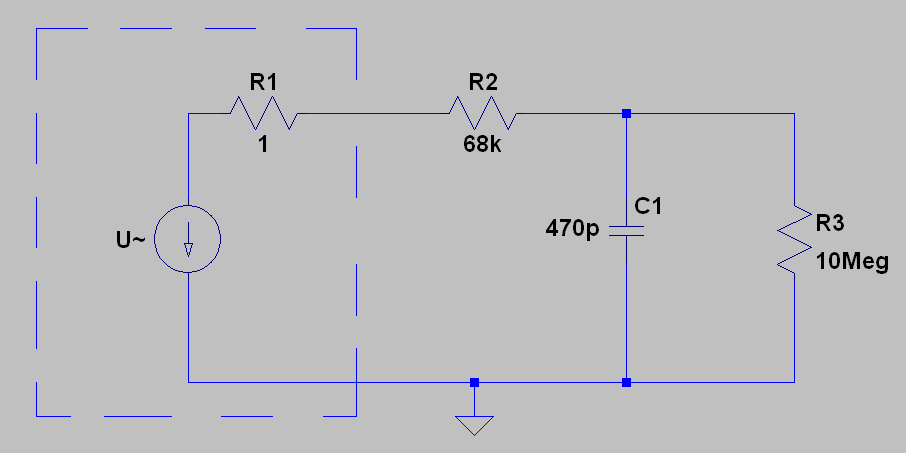 a) den Einfluß von Quell- und Last-Widerstand. Wenn Du das folgende Schaltbild betrachtest, wirst Du am Ausgang in sehr guter Näherung den idealen Frequenzgang eines RC-Glieds messen. In diesem Fall ein Tiefpass mit einer Grenzfrequenz von 5kHz (wie Du richtig ausgerechnet hast). Dieser ideale Frequenzgang ergibt sich aber nur, wenn wie im Schaltbild gezeigt der Quellwiderstand der Spannungsquelle (hier R1) klein ist gegen den Querwiderstand des RC-Glieds (hier R2). Und gleichzeitig der Lastwiderstand (hier R3) groß ist gegen R2.