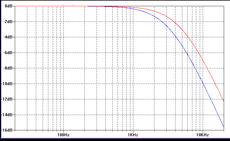 Im folgenden Bild ist dieser Frequenzgang als rote Linie dargestellt. Mit einem -3dB-Punkt bei 5kHz und enem Abfall der Amplitude oberhalb der Grenzfrequenz von 6dB (=Faktor 2) pro Oktave. Erhöht man den Quellwiderstand (Innenwiderstand) der Spannungsquelle auf z.B. 30kOhm, so ergibt sich ein anderer Frequenzgang mit einer anderen, niedrigeren Grenzfrequenz (blaue Linie). Zur Berechnung der neuen Grenzfrequenz sind R1 und R2 zu addieren. 30kOhm entspricht etwa dem Innenwiderstand einer PC(L)86-Trioden-Verstärkerstufe.