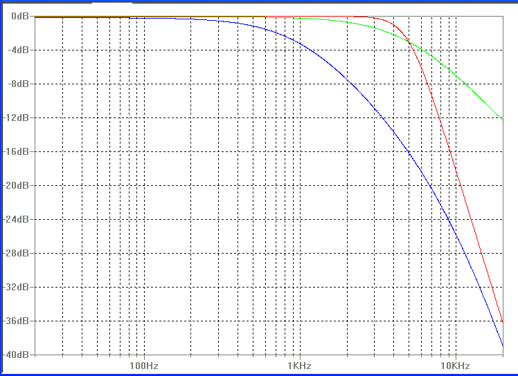 b) Im folgenden Bild siehst Du nochmal den Frequenzgang des einfachen RC-Tiefpasses (grüne Kurve). Wenn ich Dich richtig verstanden habe, wolltest Du drei RC-Tiefpässe einfach hintereinander schalten. Ich vermute, daß Du damit einen Frequenzgang wie im Bild (rote Kurve) erzielen wolltest. Also Beibehaltung einer Grenzfrequenz von 5kHz aber mit 3 x 6dB = 18dB Abfall/Oktave. Tatsächlich würde man mit Deiner Schaltung nur einen Frequenzgang entsprechend der blauen Kurve erhalten. Die hohen Frequenzen werden zwar auch stark gedämpft. Aber die Dämpfung fängt schon bei niedrigen Frequenzen unter 1kHz an.