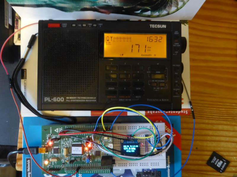Gerade eben habe ich auch eine interne Modulation in den STM32 einprogrammiert, er ließt eine kleine WAV-Datei und spielt diese endlos auf einer LW-Frequenz ab, hier die alte DLF-Frequenz von 171 kHz.