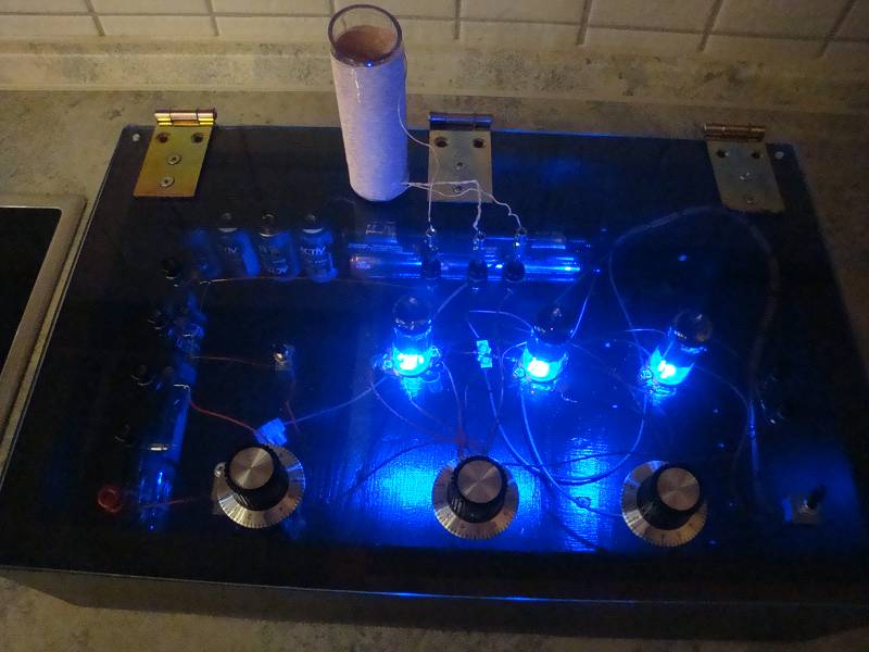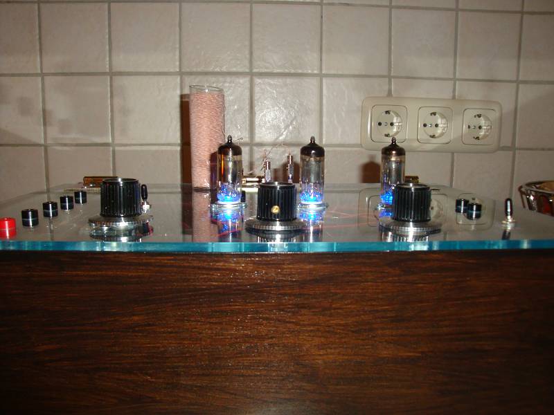 Ich habe versucht die Vergangenheit mit der Gegenwart zu verbinden. In Natura sieht man das rote glimmen der Röhren besser. Auif den Bildern überwiegt das blau. Meine EF98 sind offensichtlich Nachbauten die nicht beschriftet sind. Diese sind innen fast komplett verspiegelt so das eh nicht viel rot zu sehen ist. Ich werde auf jeden Fall für die blaue Beleuchtung noch ein Poti vorsehen so das die blaue Farbe bis fast null herunter geregelt werden kann.