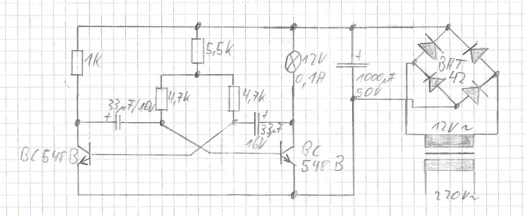 Wie ihr sicherlich noch wisst, habe ich über einen Mikroschalter am Fader die "Achtung Mikro" Schaltung realisiert. Da mich das so sehr fasziniert, möchte ich das ganze noch etwas spannender machen. Und zwar soll die Lampe "Achtung" blinken. Dafür habe ich mir eine LED Blinkschaltung umgezeichnet, da ich kleine 12 Volt Birnchen mit 0,1 A Leistung verwende.