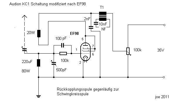 mir hat Dein KC1 Audion keine Ruhe gelassen und ich habe die gleiche Schaltung mit einer EF98 aufgebaut. Die EF 98 ist ja eine Pentode, man kann sie aber auch als Triode betreiben. Hierzu muss man die Kontakte 5,6 und 7 verbinden. Anode, Brems- und Schirmgitter. Zwei alte MW- Spulen hatte ich noch im Fundus. Ich lötete extra 50cm lange Anschlussdrähte an die Spulen und musste feststellen, dass ein scharfes Einstellen der Rückkopplung erst ab ca. 40-50cm Abstand zur Schwingkreisspule möglich war. Aber es ging schon und entsprach meinen Erwartungen einer Rückkopplung.. Weil das natürlich unpraktisch ist, habe ich der Rückkopplungsspule einen festen Abstand gegeben und ein 100kOhm Poti in die Einspeisung gehängt. Also ich kann damit die Rückkopplung jetzt fein einstellen.