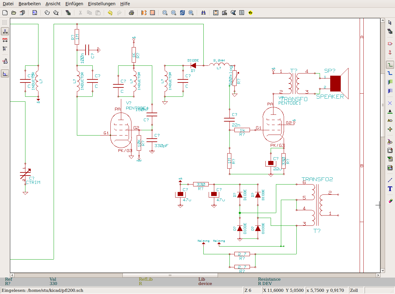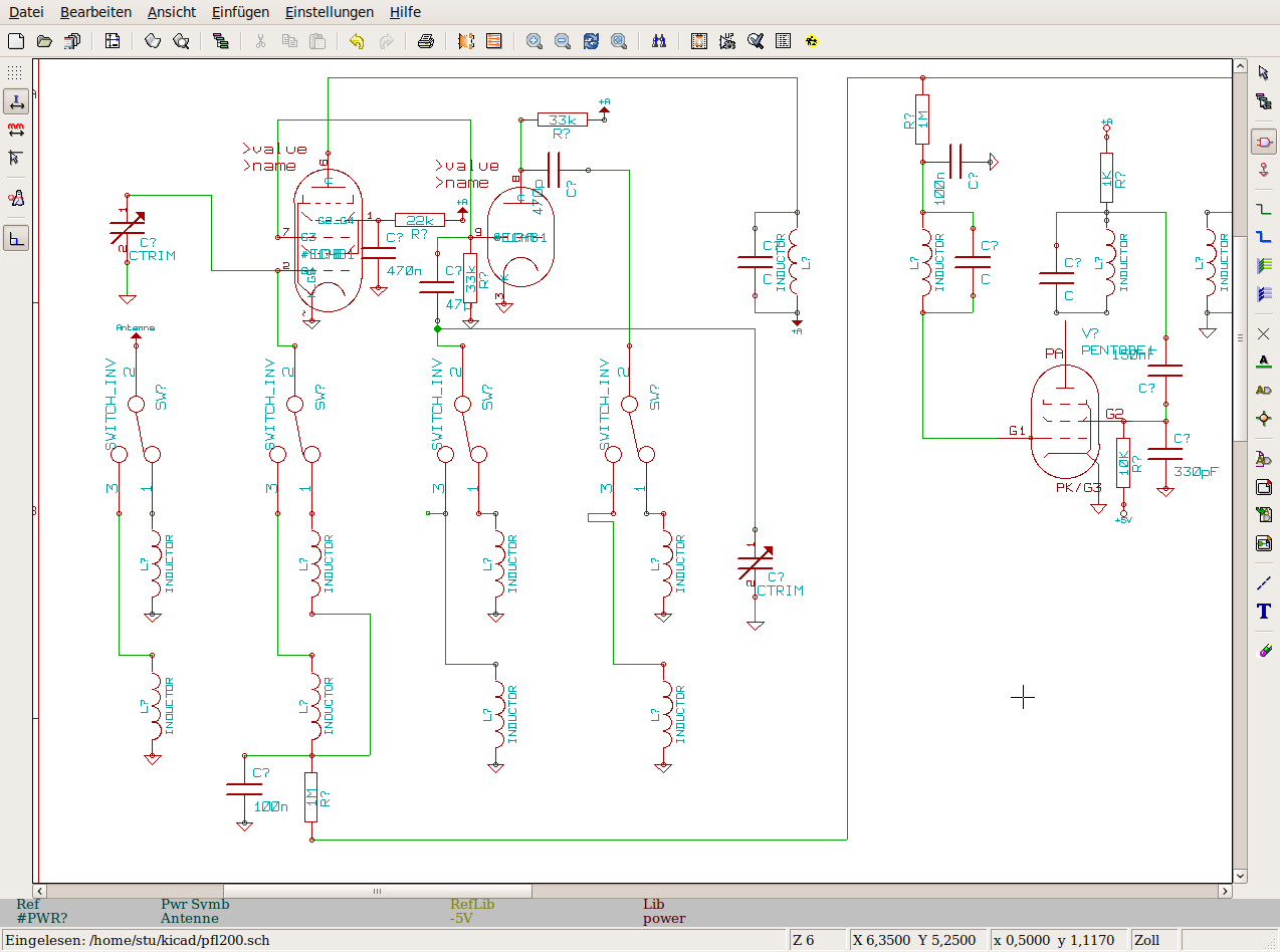 Inzwischen ist auch das Schaltbild fertig. Die CAD Software ist gewöhnungsbedürftig.Aber man kann schon erkennen was gemeint ist. Die Zwei Röhren rechts sind eigentlich eine.Die EFL200.Die Trimmer an den Schwingkreisen habe ich mir gespart. Sie sind ja für das Prinzip auch nicht so wichtig. Mein Projekt ist damit eigentlich abgeschlossen.Im großen und ganzen hat es Spaß gemacht.Auch die Klangqualität an einer Außenantenne ist nicht schlecht.Kann schon sein, das der Empfänger die nächsten Wochen als Werkstatt Radio dienen muss. VG Norbert