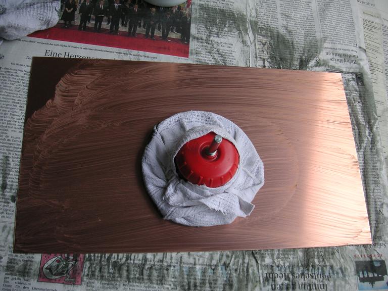 endlich konnte ich den nächsten Schritt umsetzen und mein Kupfer polieren. Dieser Vorgang sollte unbedingt vor dem Biegen erfolgen. Trotz guter Autolackpolitur, ist das Ergebnis nicht 100% frei von Bearbeitungsspuren. Scheuermilch, trotz Aufschrift "kratzerfrei", hinterlässt feine Schmirgelriefen und Ceranreiniger ist sehr aggressiv zum Cu. Angelaufene Stellen lassen sich damit aber gut reinigen.