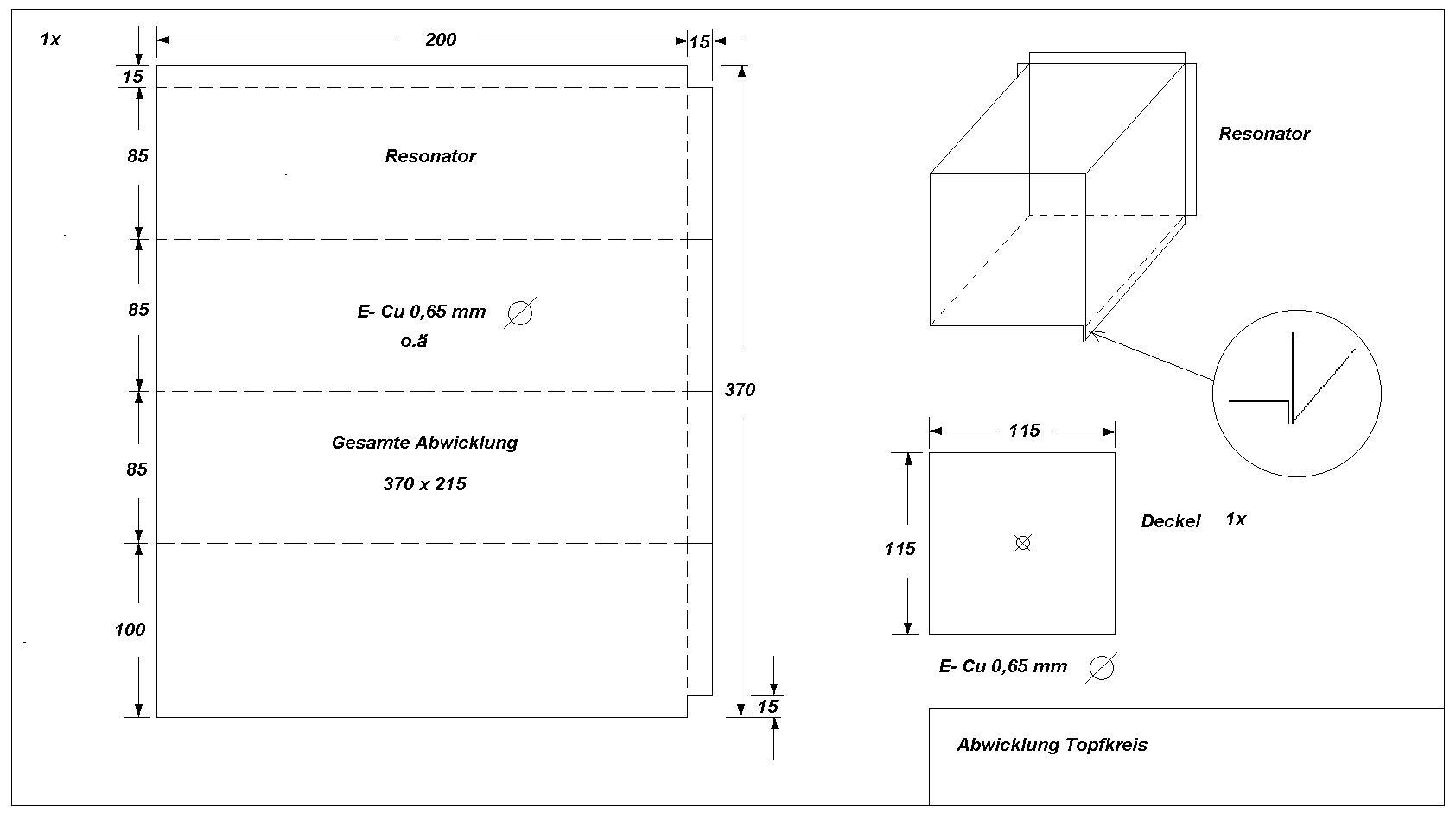 ich habe für den Resonator endlich Zeichnungen erstellt. Das Holzgehäuse für den Cu- Kasten ist etwas schmaler als das von Robert Weaver und wird mahagonifarbend . Die Abwicklung ist gar nicht so groß, wie es auf den ersten Anschein aussah. Ob ich für die Spule ein Cu- Rohr oder 10mm Rundkupfer nehme, muss ich noch überlegen. Ein Rohr in die Spulenform zu bringen ist nicht so einfach. Vielleicht mit Vogelsand füllen und dann mit Lötlampe erhitzen und um einen Dorn wickeln...