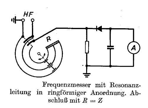 Hab mal in meine langsam wachsende Bibliothek geschaut. Hab folgende Anordnung gefunden für Frequenzen ab 80 MHz. Die Länge des Innenleiters muss über Lambda 0,25 sein von der längsten zu messenden Wellenlänge. Die Strecke vom Eingang bis zur Stelle mit der höchsten Spannung, der Resonanzfrequenz entspricht Lambda 0,25. Es handelt sich der Abbildung um eine gebogene Lecherleitung um Platz zu sparen. Die Güte einer Lecherleitung ist wesentlich höher als die eines L C Kreises und lasst somit genauere Messungen zu.