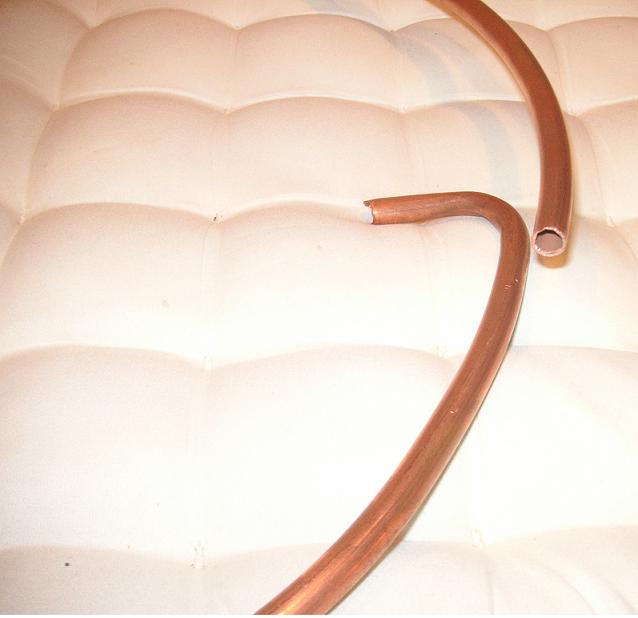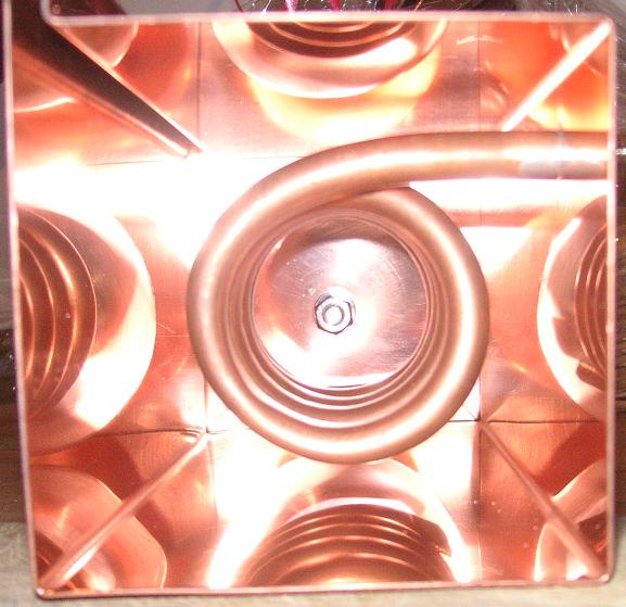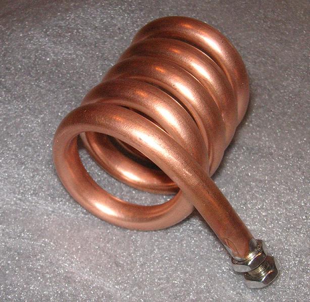 Ich habe das Rohr mit Vogelsand gefüllt und beidseitig geschlossen. Das weiche Cu- Rohr ist kalt gebogen und ein 8mm Gewindebolzen eingelötet. Das Restzinn muss auch dort noch entfernt werden, da Zinn die Güte des Topfes verschlechtert. Obwohl ich die Oberfläche des Rohres gut vorpoliert habe, verändert sich durch das Biegen die Struktur, gestaucht innen und gestreckt außen...und der Glanz geht weg. Vor dem Einbau wird die Spule mit Zahnpasta nachpoliert.