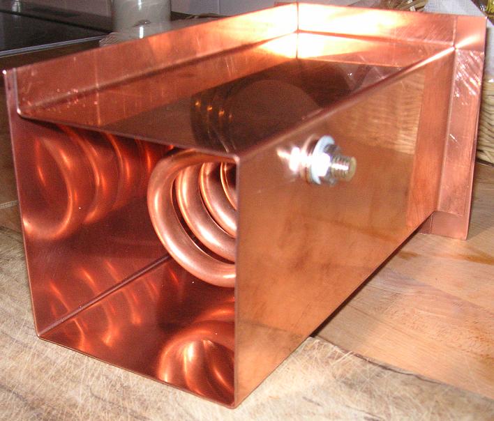 Morgen kommt der Topf aus der Biegebank...dann gibt es ein neues Foto. Die Spule mache ich Ende Dezember in meiner alten Heimat. Da existiert noch eine kl. Werkstatt mit großen Schraubstock, Lötlampe, Standbohrmaschine usw. Das Rohr wird mit Vogelsand gefüllt und verschlossen, erhitzt und um einen Dorn gebogen. Das geht nicht am Küchentisch, auch die Biegebank musste sein, da mein Cu = 1mm dick ist. E-Cu!!