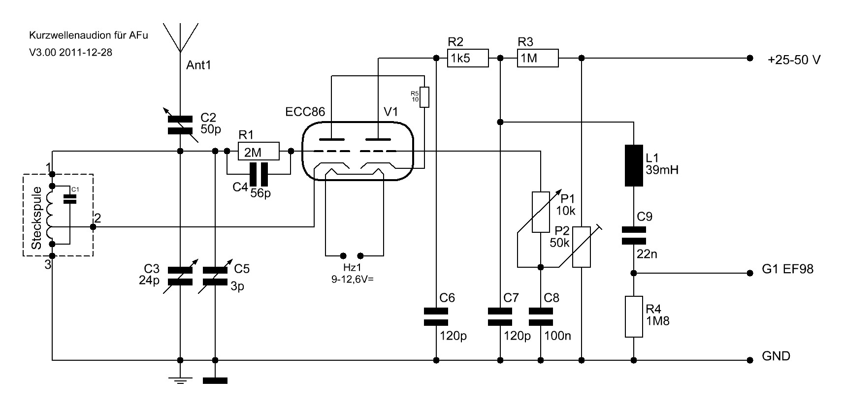 Ich habe mir den Schaltplan meines ehemals gebauten ECC86-Audions noch einmal vorgekramt und ihn ein klein wenig auf auf die hier erlangten neuen Erkenntnisse angepasst. Das sind im Wesentlichen die kapazitiv gekoppelte Antenne, die Umstellung von der RK-Wicklung auf die Kathodenanzapfung und einen zusätzlichen kleinen Widerstand zur Schwingungsunterdrückung zw. Anode und Kathode. Der Audion-Stufe würde ich dann noch eine EF98 nachsetzen, die einen kleinen Übertrager treibt. So könnte ein Filter- bzw. NF-Modul universell angekoppelt werden.