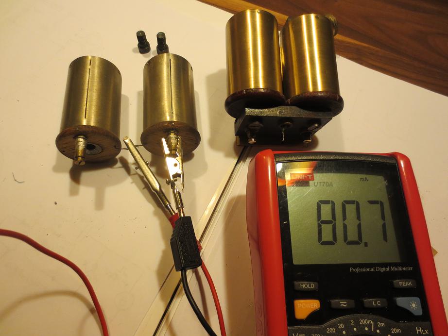 Mit 12V ist zwar schon ordentlich Magnetismus vorhanden, reichte aber doch nicht um die schwere Mechanik in Gang zu setzen. Auch eine Parallelschaltung brachte noch keinen Erfolg. Mit 42V und knappen 140mA klapperte der Apparat wieder. Das nicht eingeschliffene mA- Meter zeigte dabei sogar einen kleinen Ausschlag!! Das magnetische Feld der Spulen beeinflusst das Messwerk.