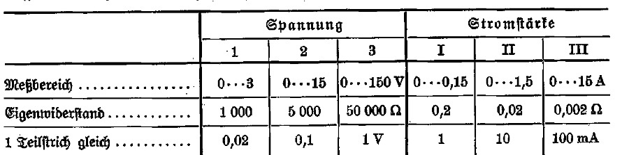 Ich hatte mich an den tragbaren Messinstrumenten der Reichspost orientiert. Hier sind die Messbereiche so wie in der obigen Tabelle eingeteilt. Die Abbildung eines solchen Gerätes G3 von vor 1907.