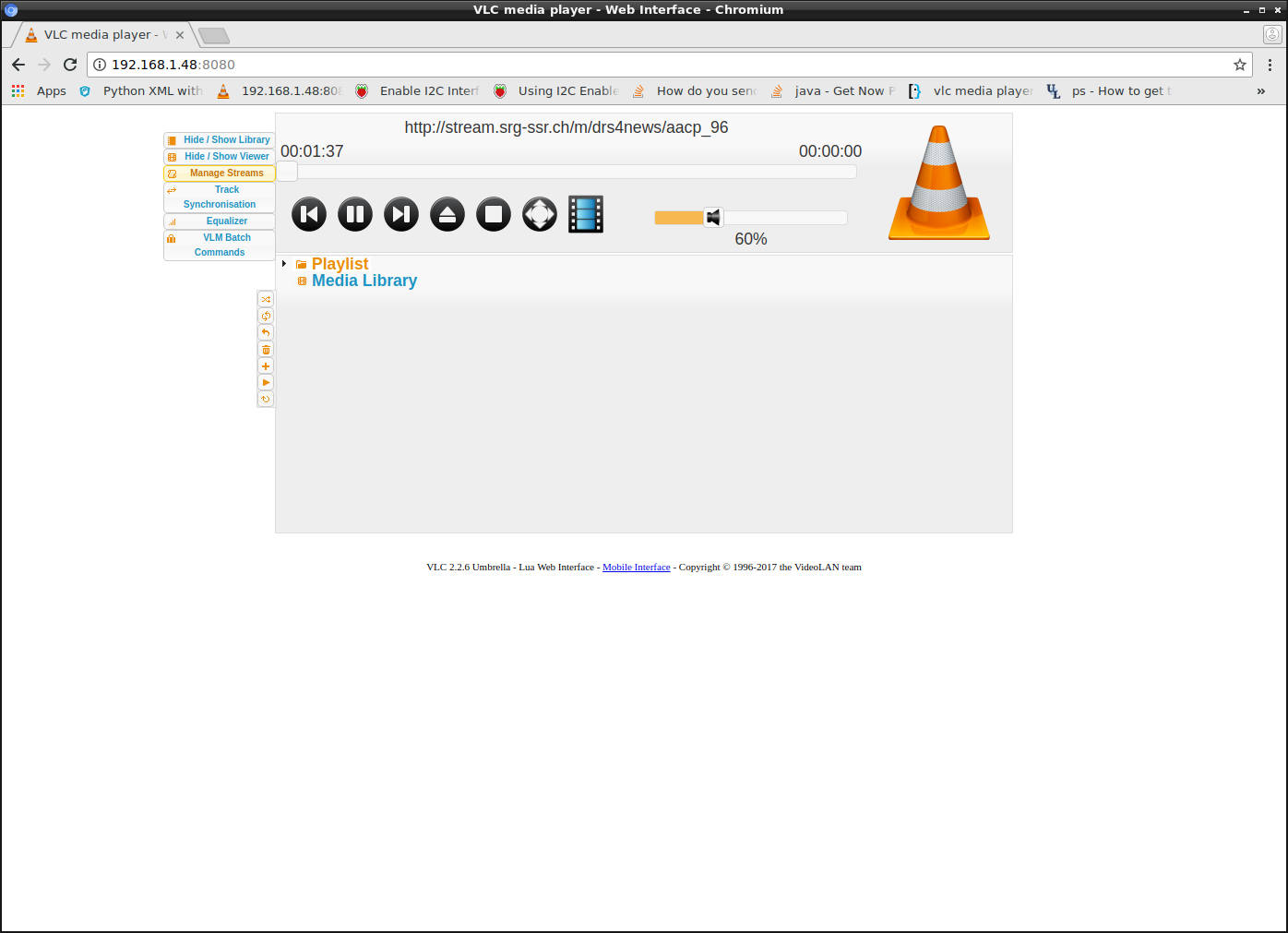 Das PIMORONI-Internetradio erhält vom Router per DHCP eine IP. Unter dieser IP stellt das Radio (genauer das Wiedergabeprogramm vlc) ein Webinterface zur Fernsteuerung zur Verfügung. Man erreicht dieses Webinterface in dem man an einem Rechner im LAN einen Webbrowser öffnet. In die Adresszeile gibt man dann die IP- des Radios ein, gefolgt von ":8080", das ist die Portnummer auf der das Radio nach Anfragen lauscht.