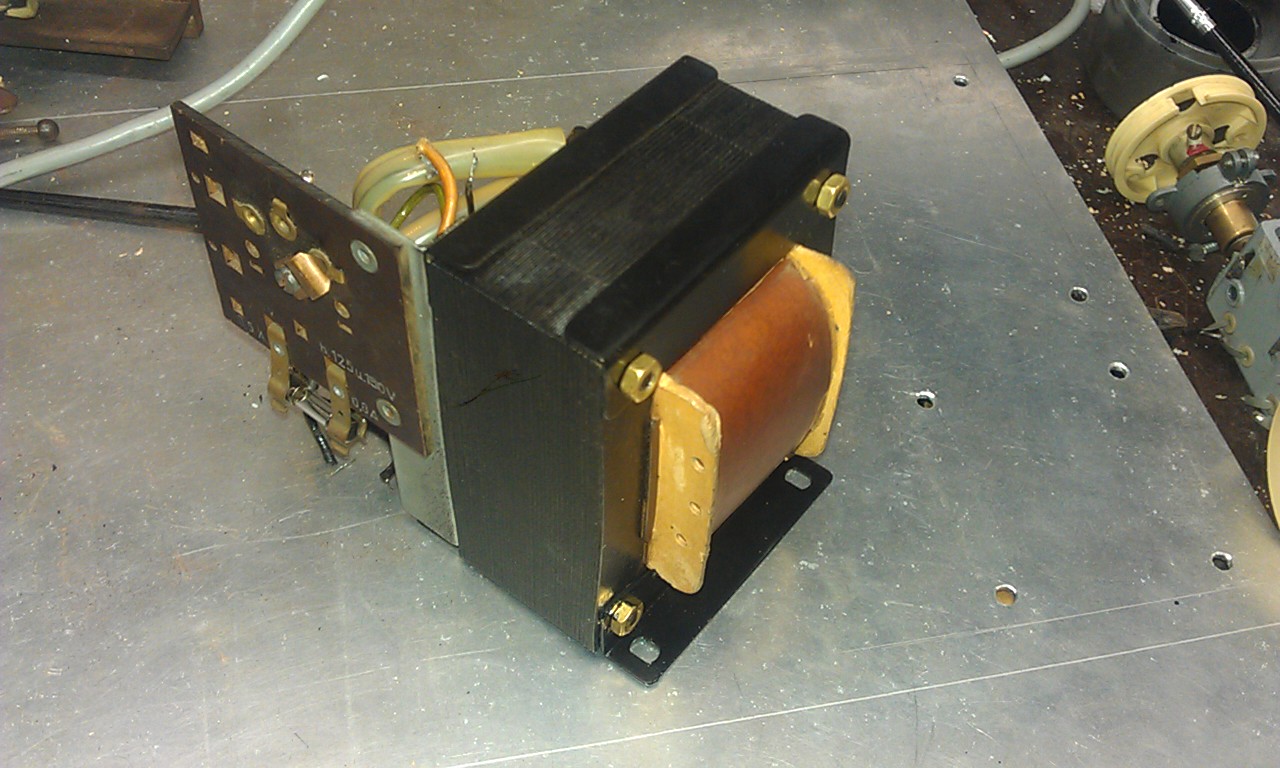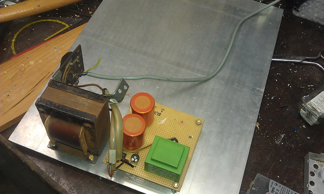 Ich hab die Platte schön geputzt und das Netzteil draufgepackt. Ich bin schon ganz zu Frieden damit. Ich bohre jetzt noch fix Löcher um Heizleitungen und Anodenspannungsleitungen durchzuführen und auch noch die "Aufnahme" für die PCL Röhre.