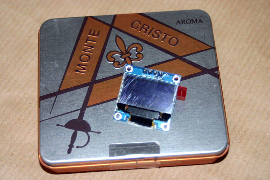Für die optische Rückmeldung des Digitalteils fehlt nun noch ein Display. Da der Bewegungssensor schon über einen I2C-Anschluß verfügt, sollte man die Gegenheit aussnutzen und nur einen Digitalbus durchs Radio ziehen, will sagen: ein Display mit I2C-Anschluß ist von Vorteil. Da ich nicht die gesamte Frequenzskala ersetzen möchte (möglichst wenig Veränderungen!) habe ich mich für ein SSD1306-OLED entschieden. Das gibt es wie Sand am Meer, ist preiswert und bietet mit fast einem Zoll Displaydiagonale genug Raum für Senderinfos.