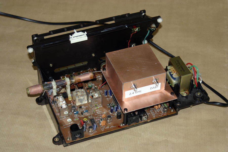 2. Ist das Digitalteil räumlich fertig aufgebaut, so nimmt man dünnes Weißblech, kanntet passend ab und verlötet dieses "Häubchen" mit der Arbeitsplattform, in dem Fall der Leiterplatte. An der Leiterplatte erfolgt dann an einer Stelle eine solide Verbindung mit der Schaltungsmasse des Analogteils, ich nehme hierzu immer breite (schon benutzte) Entlötlitze - eine wunderbare Art der Wiederverwendung(!). HF-Leitungen (für DAB oder 2.4 GHz) sind über geschirmte Leitungen auf die Rückseite zu legen. Der Anschluß externer Antennen für Wifi/Bluetooth am Raspberry ist kein Problem und mit etwas Übung leicht beherrschbar. Durchführungen für Busleitungen entweder minimal halten (reicht in der Regel aus) oder über eine HF-taugliche Stecker/Buchsenlösung nach außen führen (Luxusausführung).