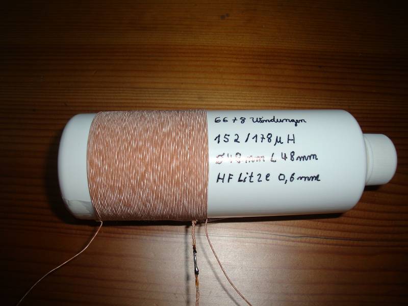 Wickelkörper Flasche aus Kunststoff (leer) Durchmesser 48mm Lange der Wicklung ganz genau 48mm Demnach Verhältnis Durchmesser zu Länge = 1 Anfang bis Anzapfung 66 Windungen 1. Anzapfung bis Ende 8 Windungen Anzapfung in der Nähe der Spule bereits verlötet Material HF Litze Durchnesser 0,6mm