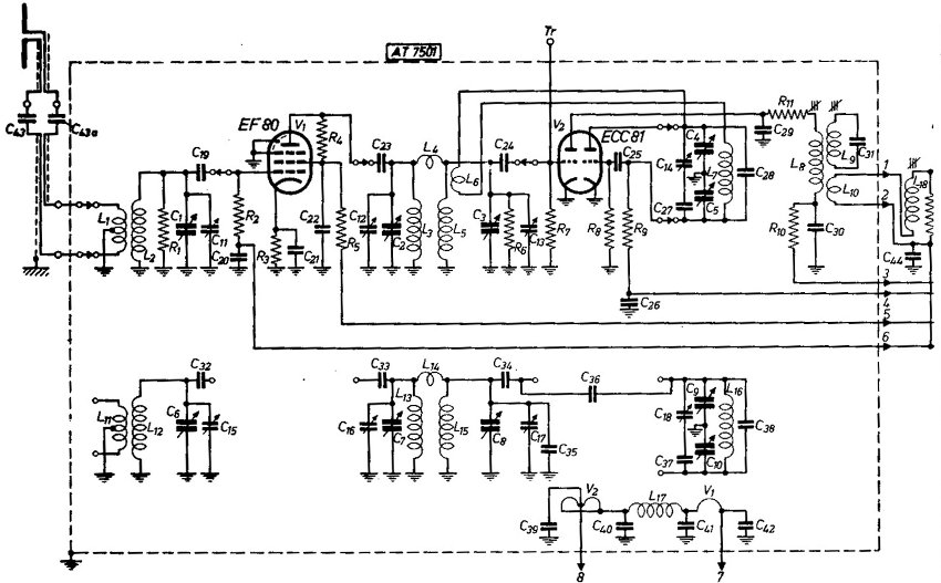 Bin mal von der "anderen Seite" an das Vorstufenproblem herangegangen. Von der kürzeren Welle eines Fernsehsignals. Frühe Fernsehempfänger hatten für das damalige Bd I auch eine KB Vorstufe mit der EF 80. Diese Möglichkeit einer Schaltung wäre mit Sicherheit einfacher als eine RC Verstärkung mit einem hohen Anodenwiderstand stabil zu bekommen. Die Zweite EF 80 ist hier als Mischstufe geschaltet, könnte natürlich auch ein Audion sein. Eine Anpassung an EF 183, 184 wäre bestimmt möglich.