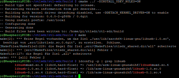 pi@RaspberryPI3B:~/rtlsdr/rtl-sdr/build $ make make[2]: *** Keine Regel vorhanden, um das Ziel „/usr/lib/aarch64-linux-gnu/libusb-1.0.so“, benötigt von „src/librtlsdr.so.0.6git“, zu erstellen. Schluss. CMakeFiles/Makefile2:228: die Regel für Ziel „src/CMakeFiles/rtlsdr_shared.dir/all“ scheiterte make[1]: *** [src/CMakeFiles/rtlsdr_shared.dir/all] Fehler 2 Makefile:127: die Regel für Ziel „all“ scheiterte make: *** [all] Fehler 2