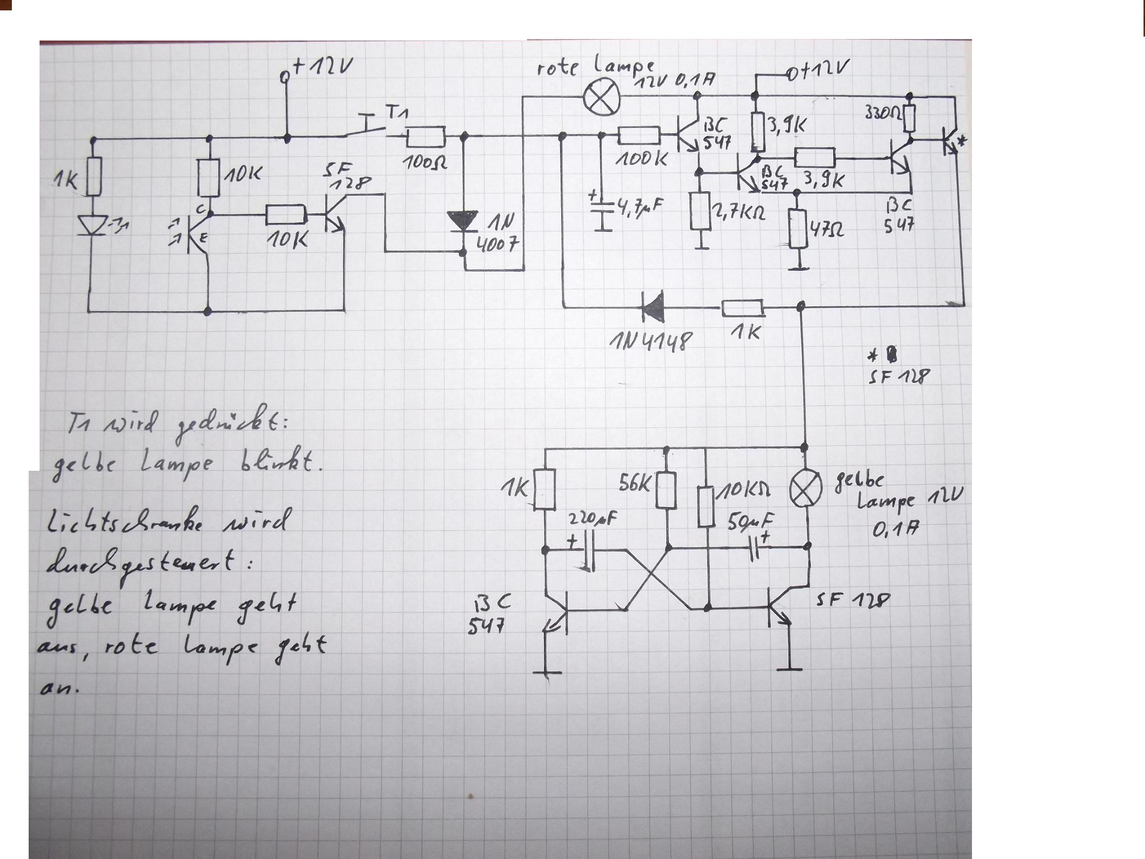 Hallo Technikfreund, ich habe mir Deine Schaltung mal angesehen. Mit Deinen Vorstellungen von der Funktion der einzelnen Teile stimmt sie aber nicht überein, d.h. sie macht m.E. nicht das, was Du willst. Ich versuche mal, die einzelnen Zustände, so wie ich sie verstanden habe, nachfolgend aufzulisten. 1. Zustand: Das Mischpult ist eingeschaltet, noch nichts wurde betätigt, der betreffende Schieberegler ist in Nullstellung (Lichtschranke inaktiv, da Lichtstrahl durch den Schieber unterbrochen), rote und gelbe Lampe sind AUS.
